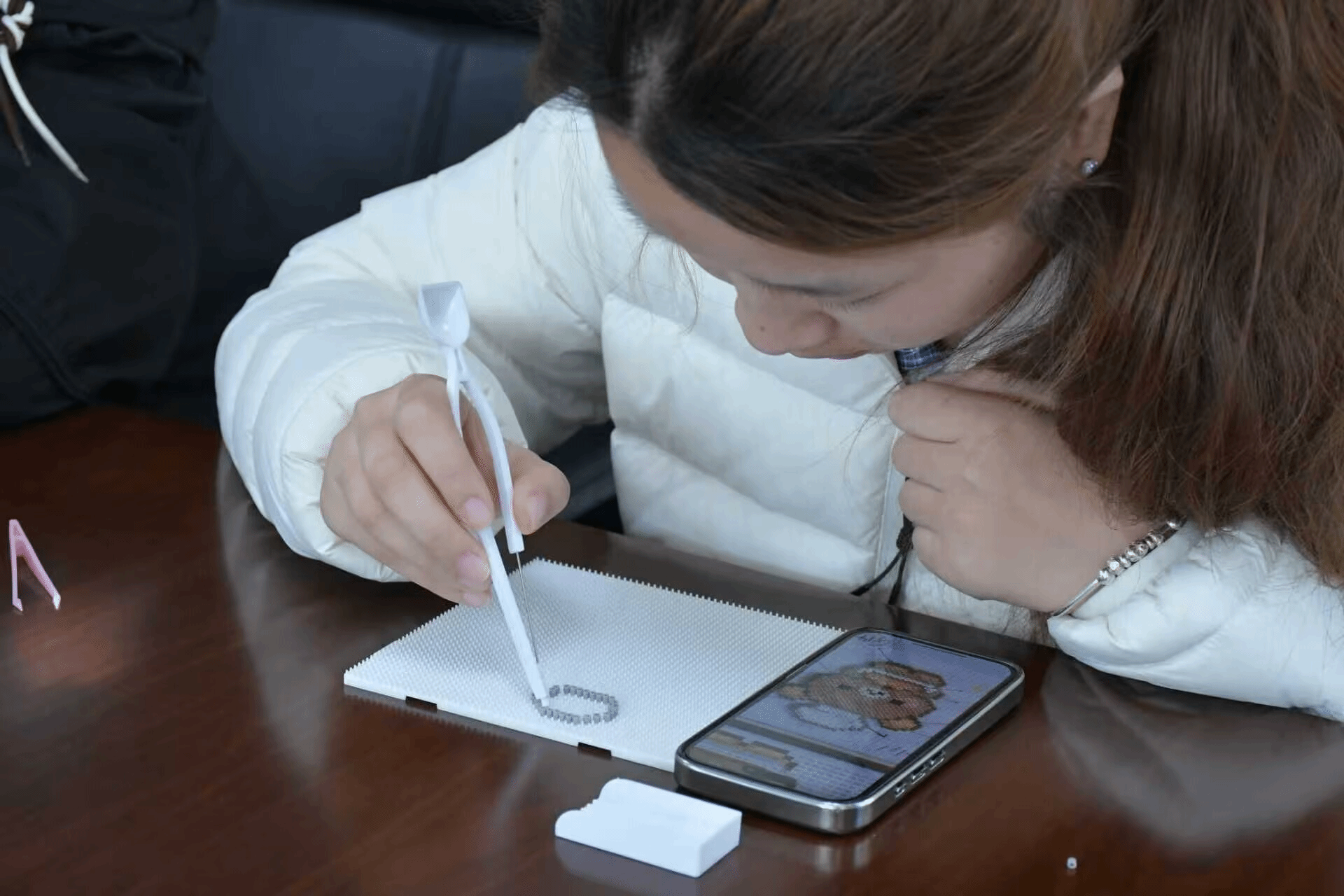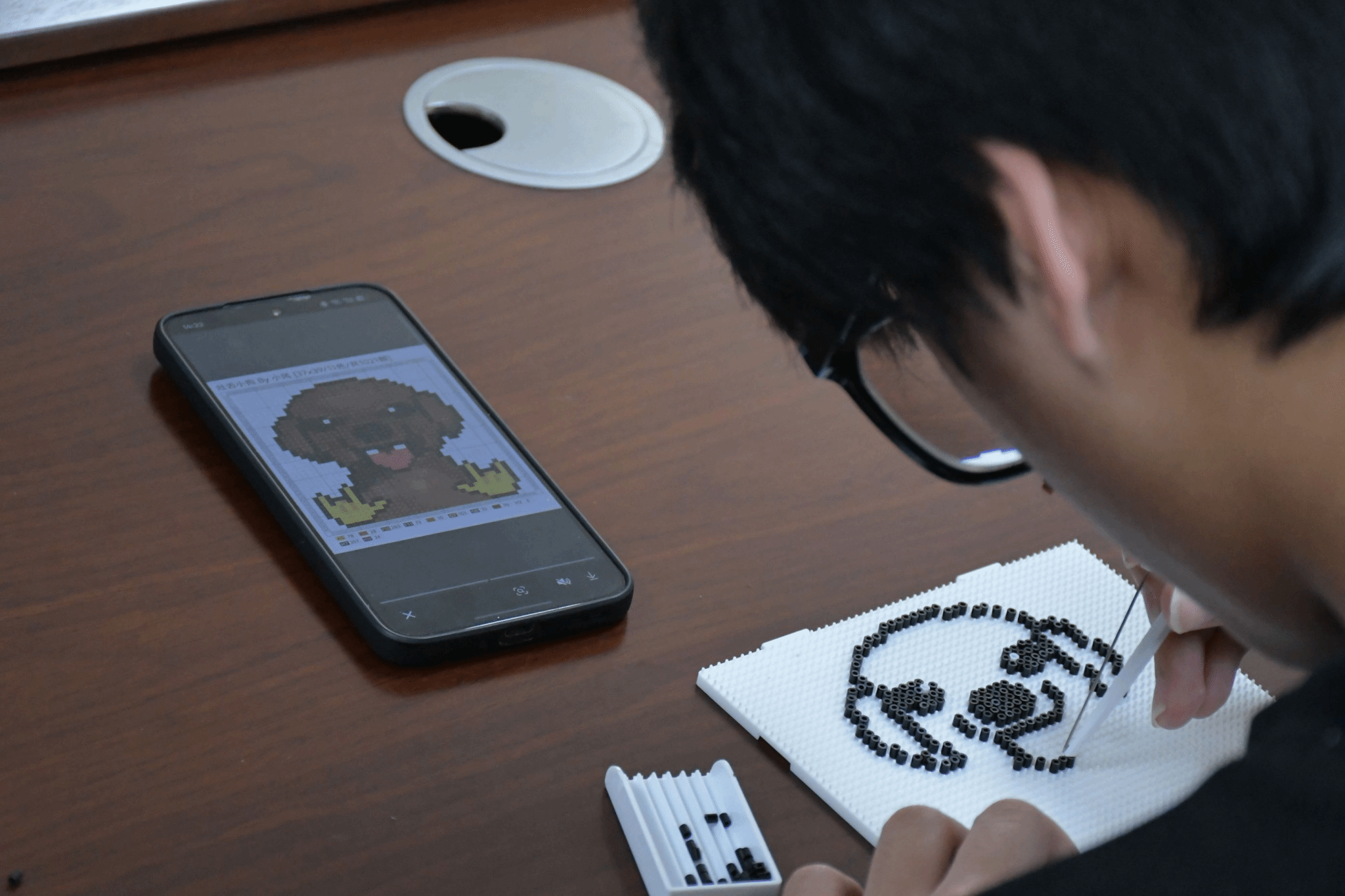 活动现场,5人为一组,工作人员提前为各小组分发拼豆、模板、镊子等工具,学生们依据印有公式、电路图等科技符号的图纸创作,亦可自主调整设计方案。小组成员分工协作,有的挑选拼豆颜色,有的专注精准拼合,在交流互动中快速熟悉彼此。作品完成后,所有拼豆作品集中陈列,学生们分享创作思路。活动最后,全员投票评选出最佳作品,进一步强化了参与体验。