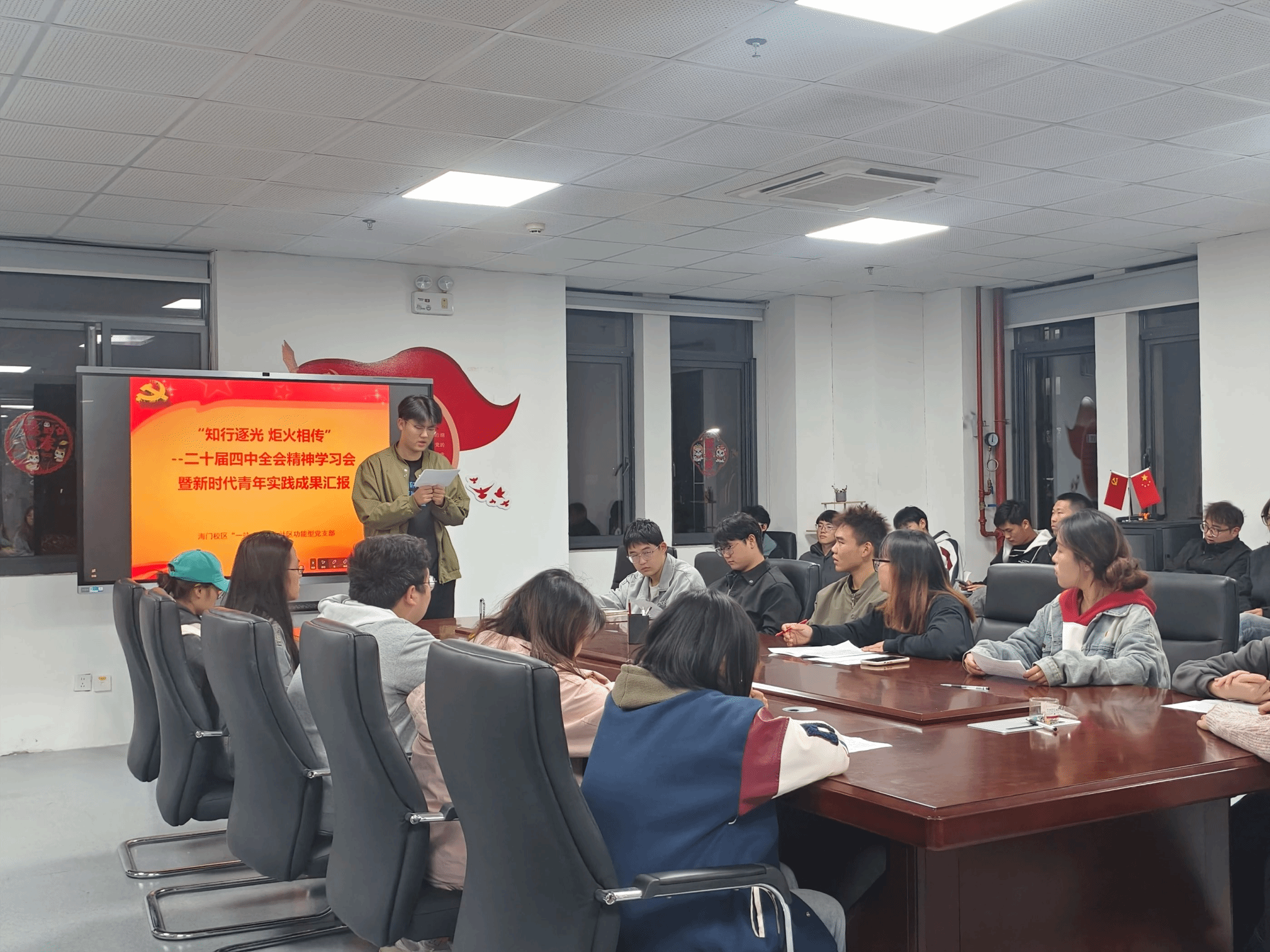 为深入学习贯彻党的二十届四中全会精神,引导青年学子在实践中增长才干、提升思想,信息工程学院于11月2日在海门校区“一站式”学生社区会议室举办“知行逐光 炬火相传”党的二十届四中全会精神学习会暨新时代青年实践成果汇报会。活动由信息工程学院主办,海门校区全体入党积极分子参加,辅导员徐洁老师主持会议并带领学习。