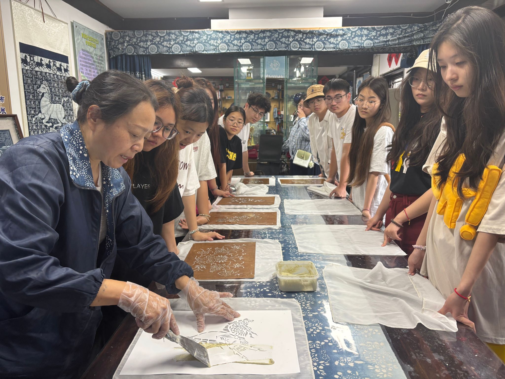 在国家级非遗传承人的悉心指导下,师生们沉浸式体验了蓝印花布从纹样设计、刻版刮浆到浸染晾晒的全流程。活动创新采用结对模式,学长与24级学生组成创作小组,在靛蓝浸染间传递技艺精髓,在协作交流中分享成长心得。心理辅导员徐洁介绍:“蓝印花布制作过程中的'留白'艺术,恰如心理健康教育中的留白技巧,给予学生自我成长的空间。”