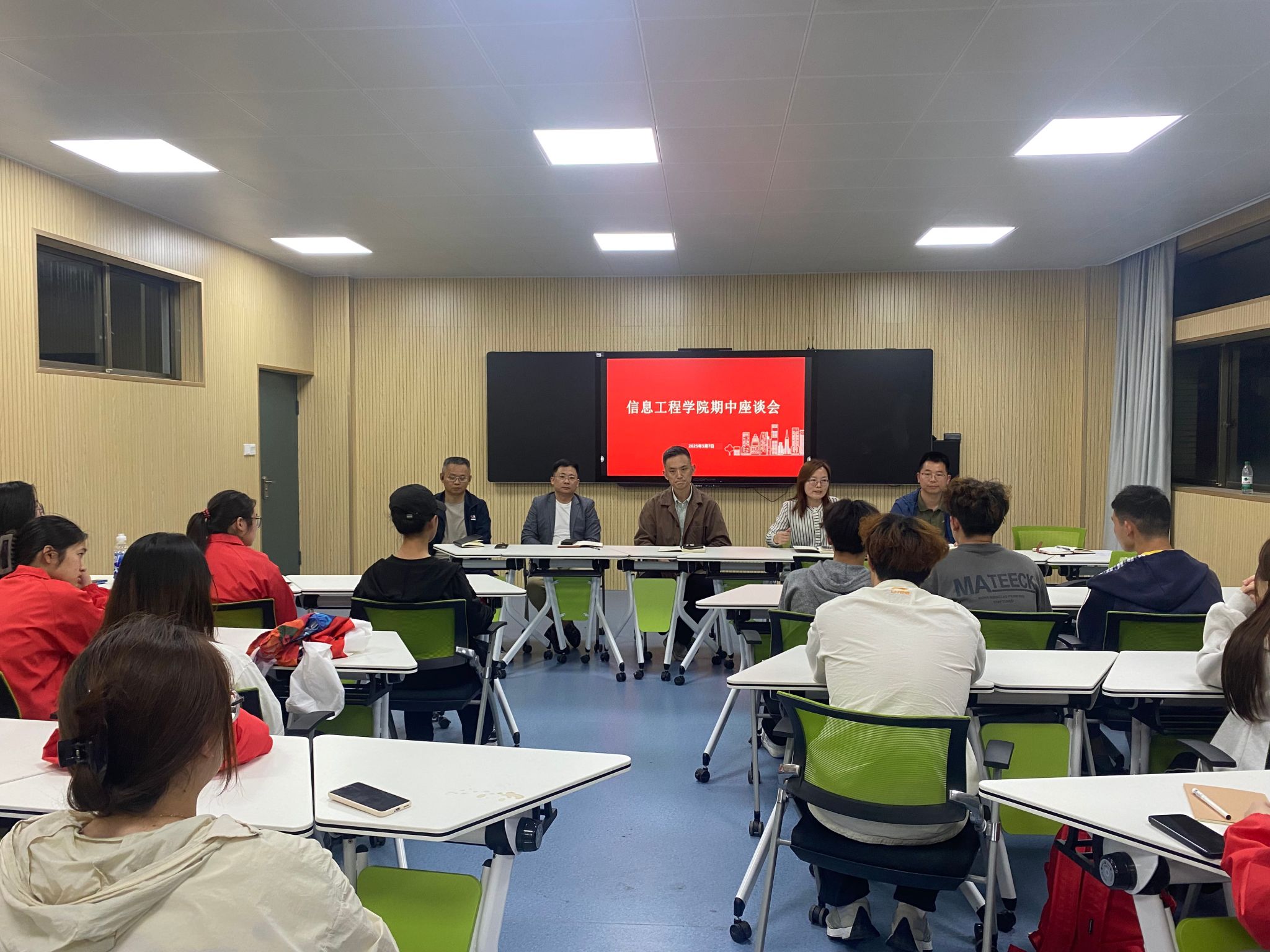 为精准把握教育教学动态,切实提升教学管理服务水平,信息工程学院于近日分别在海门、崇川两校区召开期中师生座谈会。学院党总支书记朱建泉、副书记高飞、副院长王欣、教研室主任庄国强、季峰、窦贤振和教师代表张新耐、陆阳阳参加会议,面对面的同60余名学生代表展开交流。