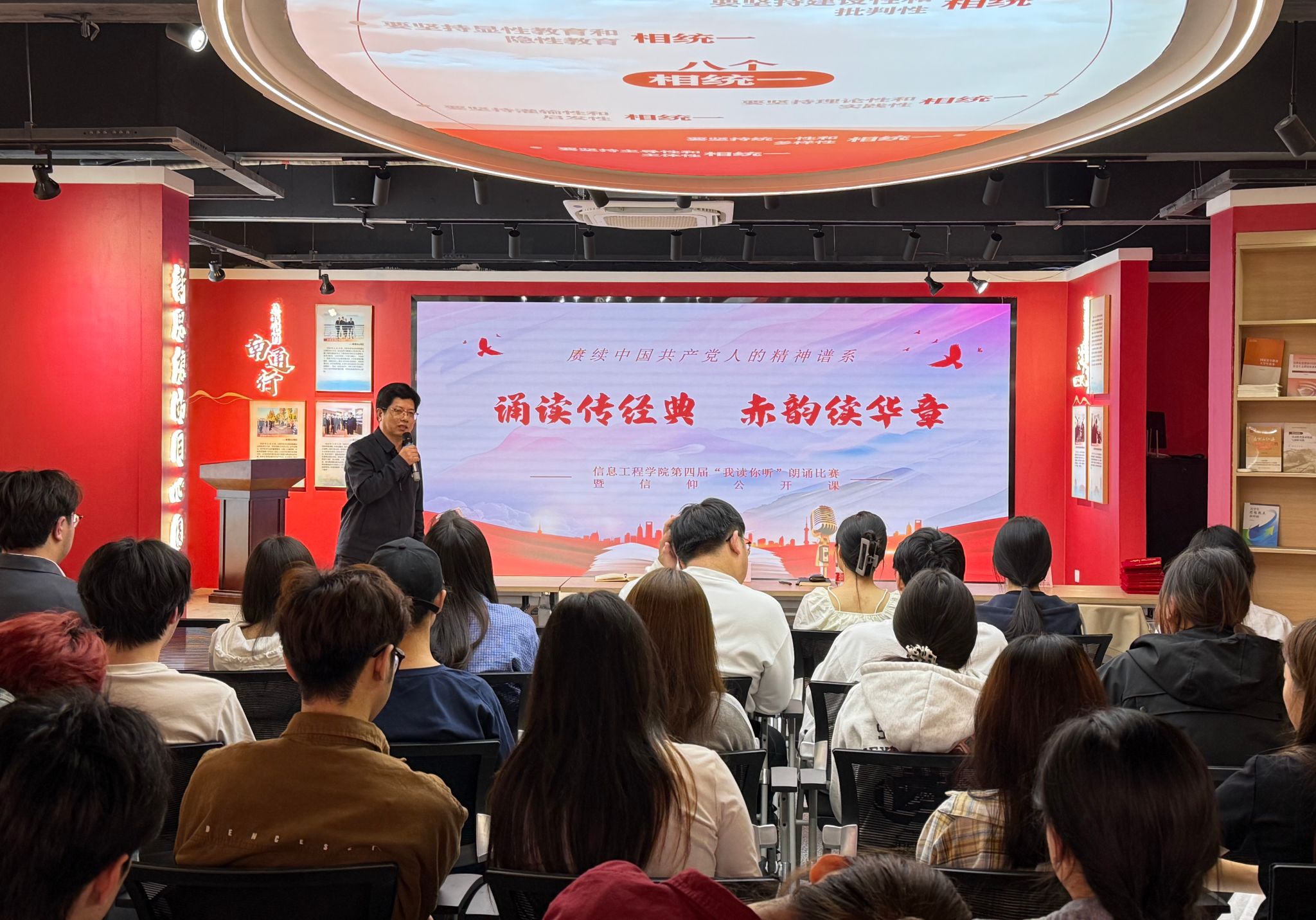4月9日下午,由信息工程学院先锋工作站、学院关工委、信者无疆工作室联合举办的第四届“我读你听”朗诵比赛暨信仰公开课在新思想践悟馆精彩上演。学院党总支书记、关工委主任朱建泉,党总支副书记、关工委副主任高飞,辅导员徐洁、朱春燕与学生代表参加活动。