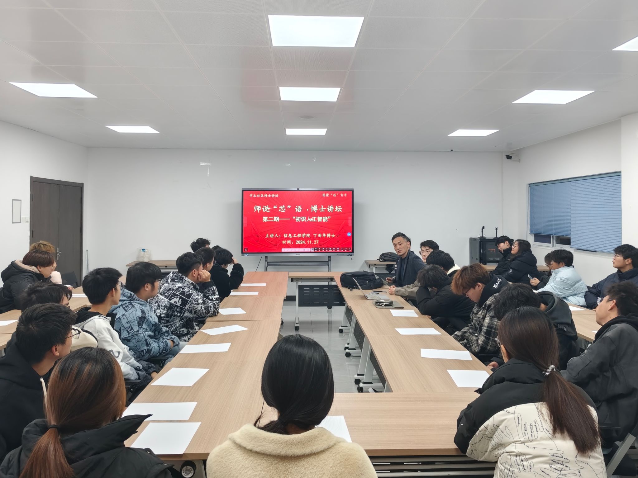 11月27日,信息工程学院在崇川校区“一站式”学生社区举办第二期“师说‘芯’语·博士讲坛”。学院丁雨华博士应邀作题为“初识人工智能”的学术讲座。本次活动由学院党总支副书记、关工委副主任高飞主持,学院社区辅导员韩政,23、24级学生代表参加交流。