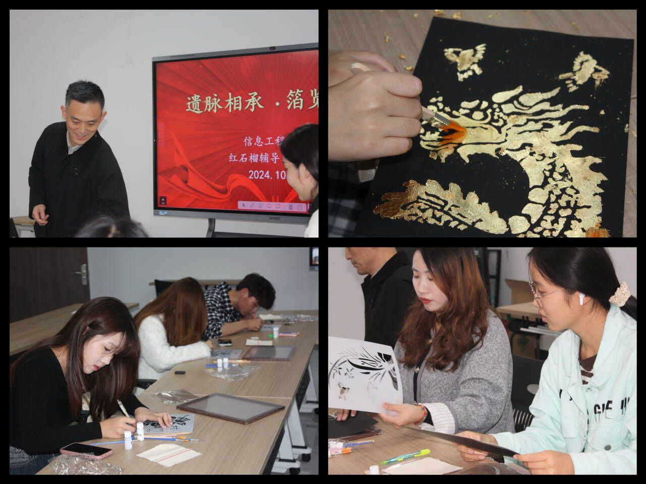 石榴花艳,瓣瓣同心。为助力学生铸牢中华民族共同体意识,共绘民族团结“同心圆”,10月30日,学校红石榴辅导员工作室在崇川校区一站式社区中心开展以“‘遗’脉相承,箔览匠心”为主题的非遗金箔绘画活动。信息工程学院党总支副书记、关工委副主任高飞,关工委秘书长秦亚杰参加本次活动,信息工程学院民族生辅导员韩琦进行主讲演示。