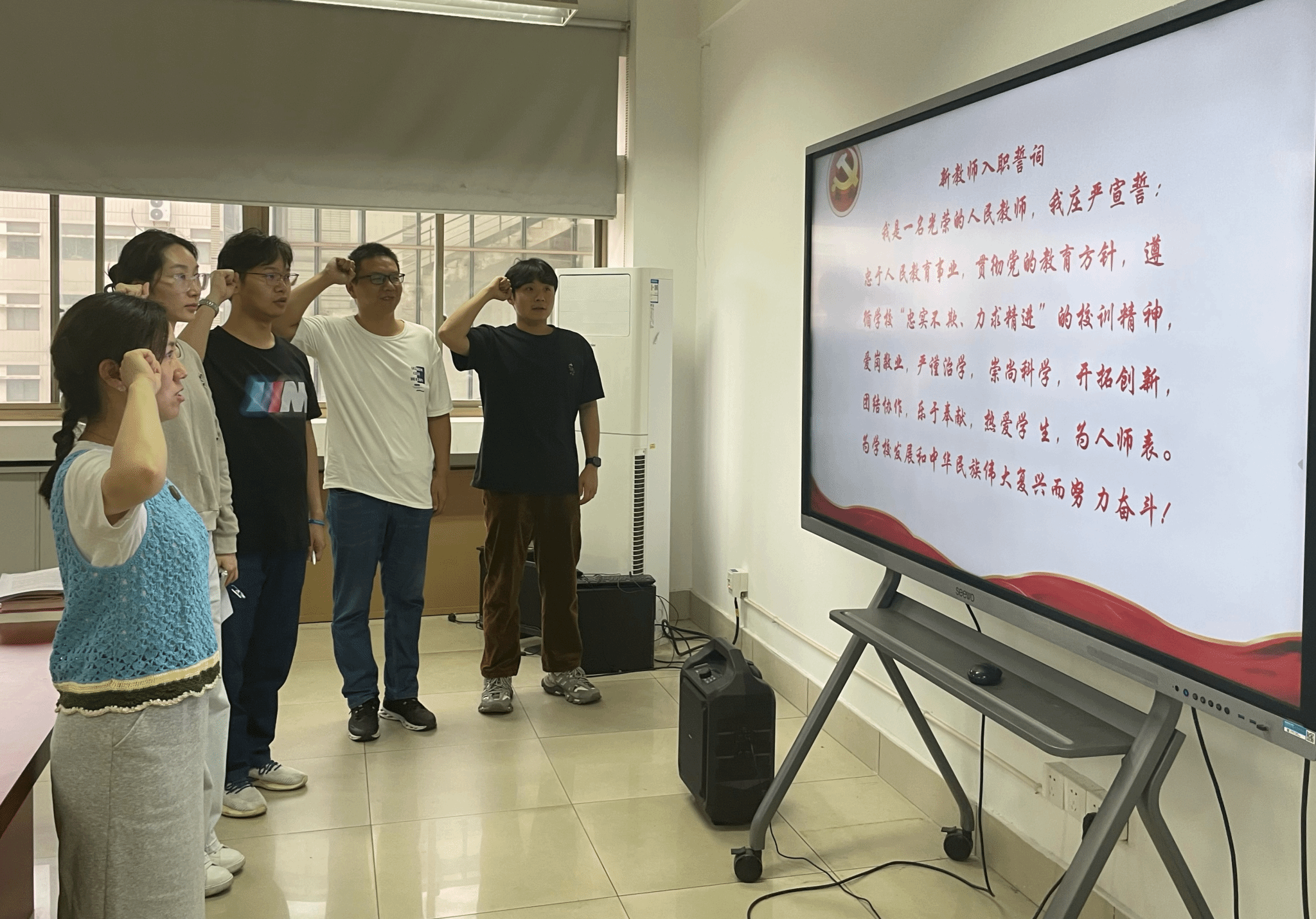 党课最后,在校师德标兵何晖老师的领誓下,全体教师庄严宣誓,重温入职誓词,不忘教育初心。新入职教师郑重签订了《江苏工程职业技术学院师德师风承诺书》。