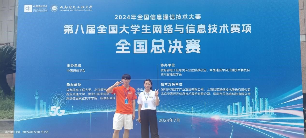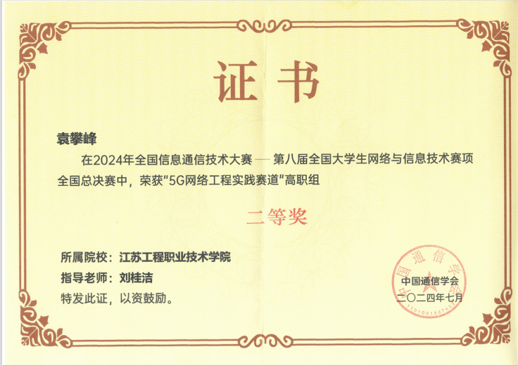 近日,由中国通信学会主办,北京邮电大学、西安交通大学、南京邮电大学等高校承办的第八届全国大学生网络与信息技术大赛成功举办。信息工程学院23移动通信班学生袁攀峰,在指导老师刘桂洁带领下,荣获“5G网络工程实践赛道"高职组赛项二等奖。