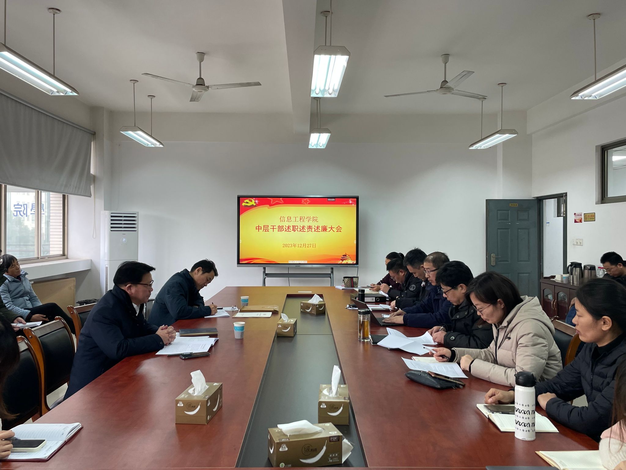 12月27日下午,信息工程学院在强毅楼304会议室召开2023年度中层干部述职述责述廉大会。校党委副书记、校长陆锦军到会指导,校纪委副书记、纪委办主任郭智君到会督导。会议由学院党总支书记朱建泉主持,全体教职工参加。